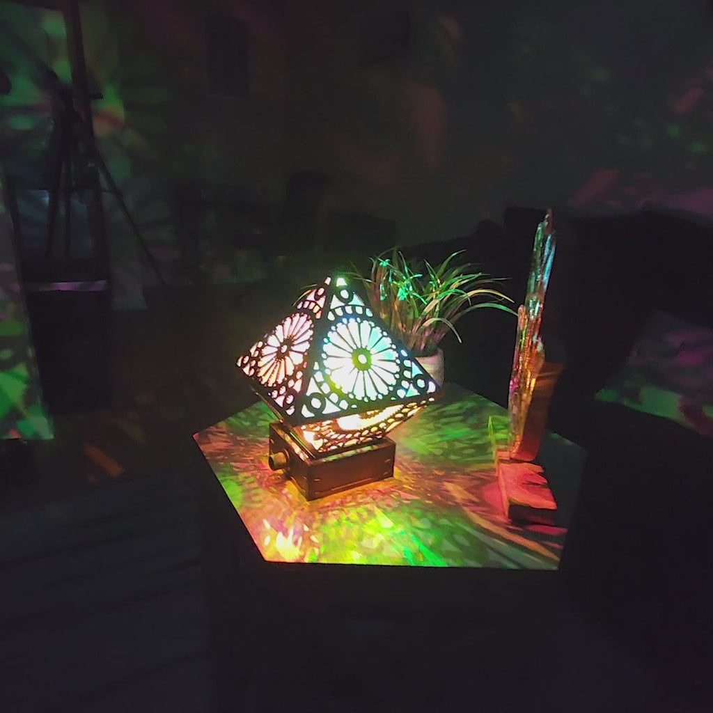 The inside of the lamp becomes an infinity prism when turned on, and the inside of your room features patterns reminiscent of the mosque design!